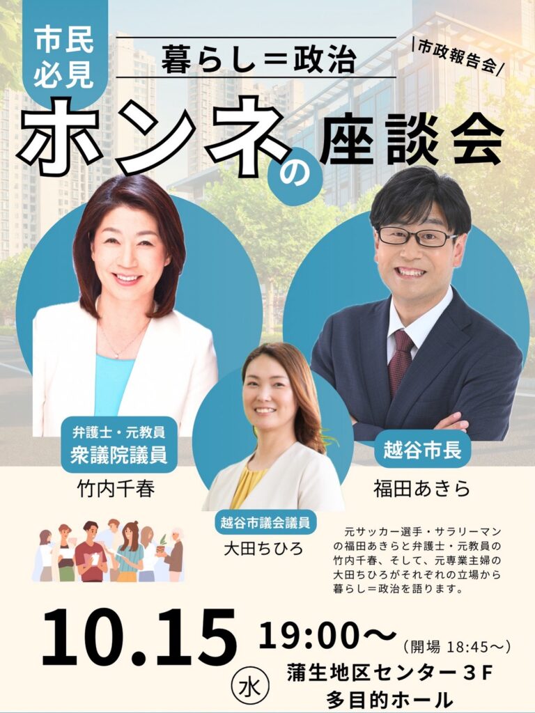 市政報告会に竹内千春も参加します。福田あきら市長、大田ちひろ越谷市議と越谷市政と国政についてざっくばらんに語ります。ぜひお立ち寄りください。